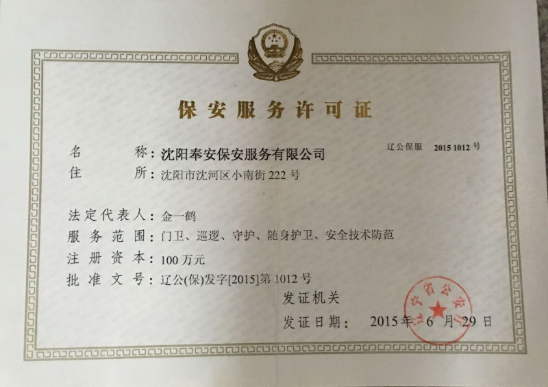 沈陽奉安保安服務(wù)有限公司(原沈陽市沈河區(qū)保安服務(wù)公司)創(chuàng)建于一九八八年八月,是遼寧省公安廳、沈陽市公安局批準(zhǔn),工商行政部門登記注冊,全市首家具備保安資質(zhì)的特殊性服務(wù)企業(yè),隸屬于沈陽市沈河區(qū)政府直管的全民國有企業(yè),現(xiàn)為中國保安協(xié)會(huì)會(huì)員單位和省保協(xié)、市保協(xié)常務(wù)理事單位:在全市同行業(yè)中率先通過ISO國際質(zhì)量認(rèn)證,是市工商局批準(zhǔn)的“重合同守信用”免檢單位和沈陽市政府采購中心保安服務(wù)項(xiàng)目重點(diǎn)競標(biāo)單位;擁有一支專業(yè)化、標(biāo)準(zhǔn)化、職業(yè)化的高素質(zhì)保安隊(duì)伍,是公安機(jī)關(guān)重要的輔警力量。